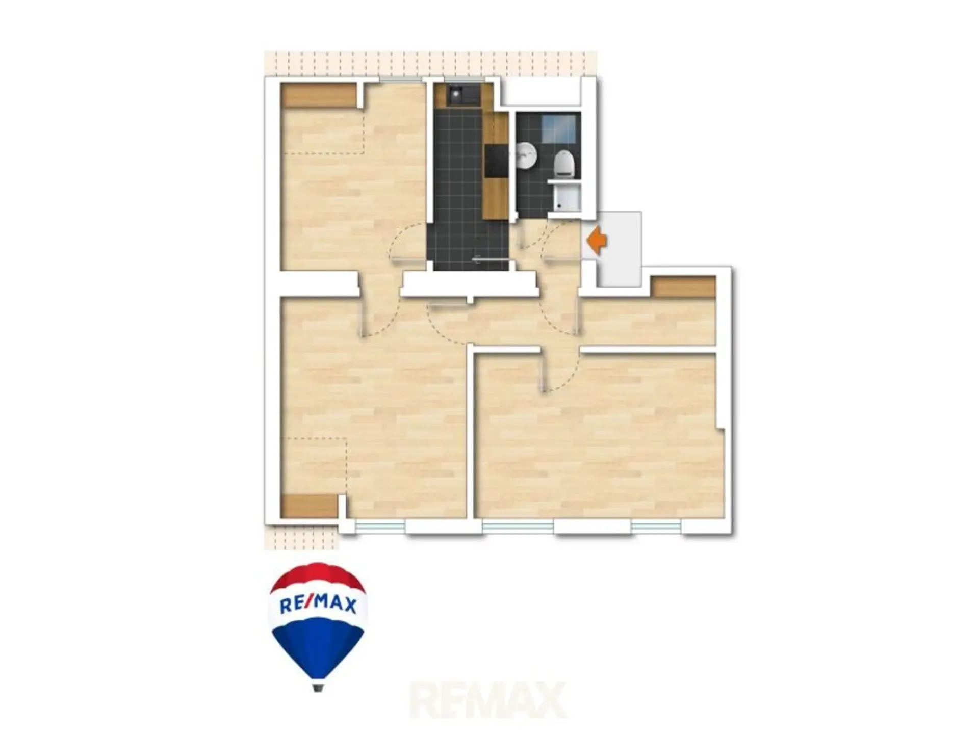 Aktuell verfügt das Objekt über drei zentral begehbare Zimmer, eine separate Küche und ein Bad mit Dusche und WC.
