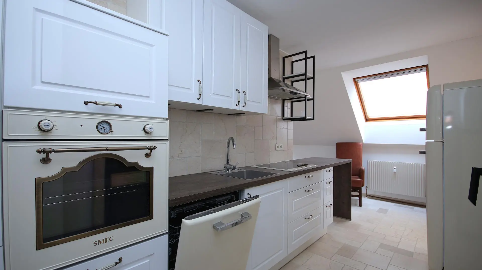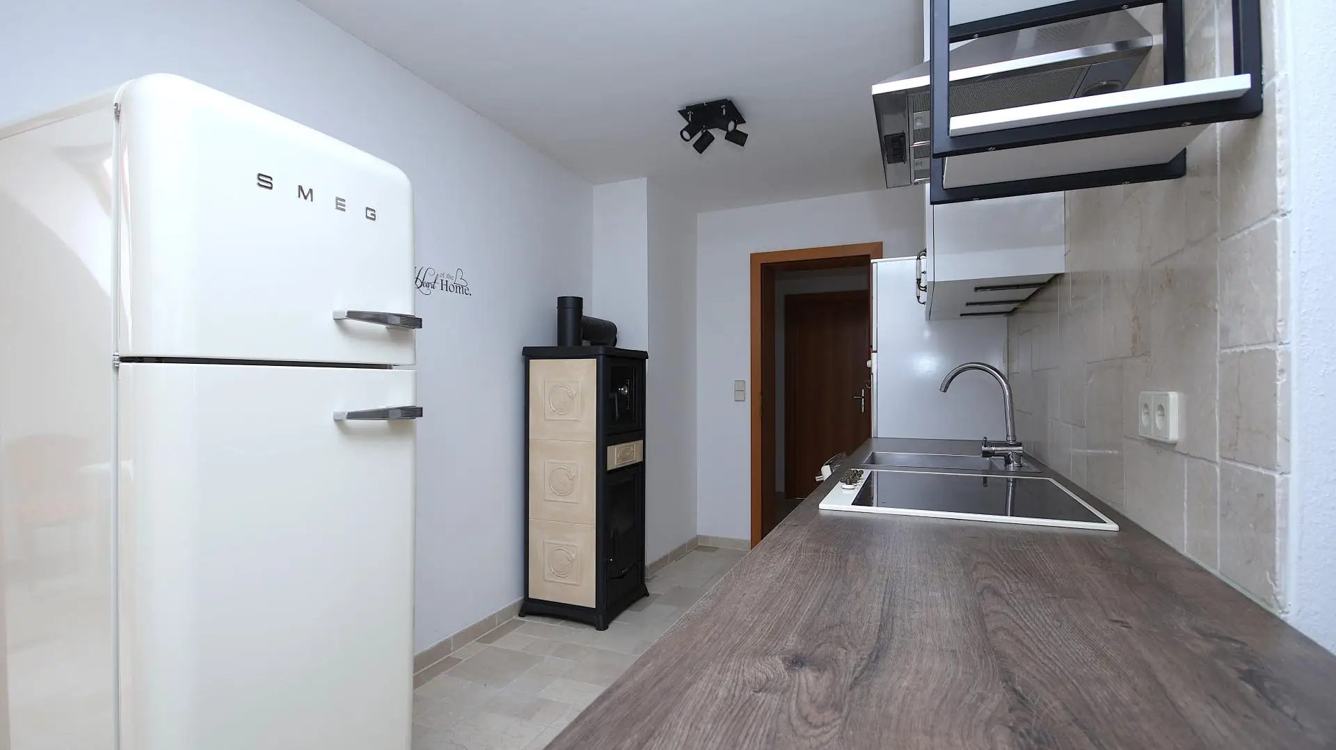 Ein besonderes Highlight der Wohnung ist die stilvolle Küche im charmanten Retro-Design mit hochwertigen Geräten sowie einem neuen Kaminofen, der nicht nur für eine einzigartige Wohnatmosphäre sorgt, sondern auch zum Kochen verwendet werden kann. Die Wohnung überzeugt zudem durch eine sehr gute Raumaufteilung und bietet mit einem vorhandenen Kellerabteil zusätzlichen praktischen Stauraum.