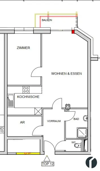 Vom Wohnraum aus gelangt man auf den überdachten Balkon, der einen gemütlichen Rückzugsort im Freien bietet.