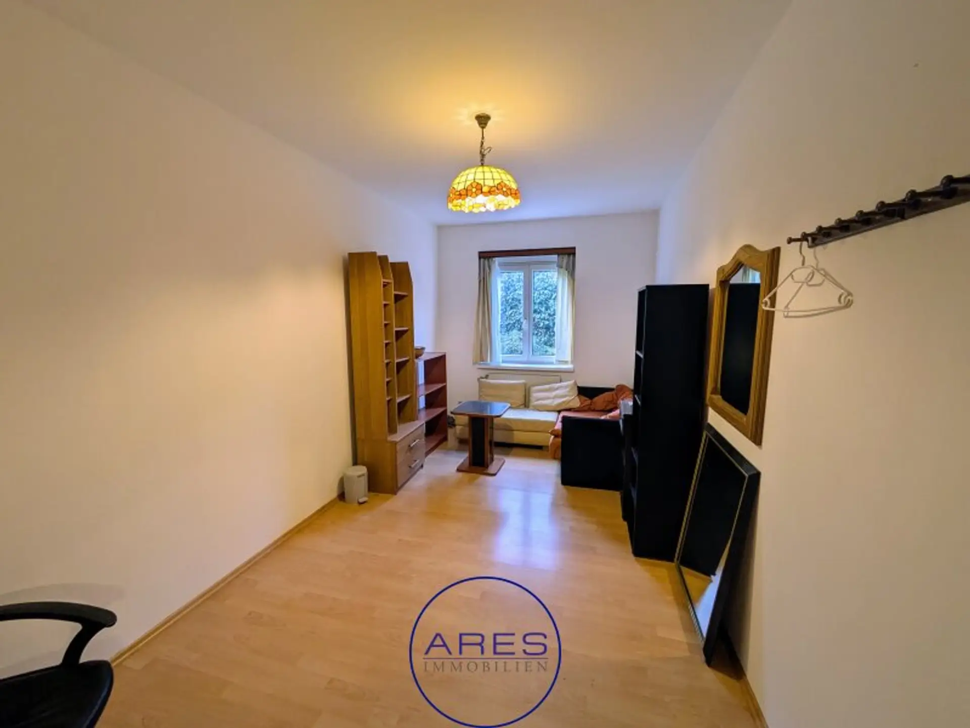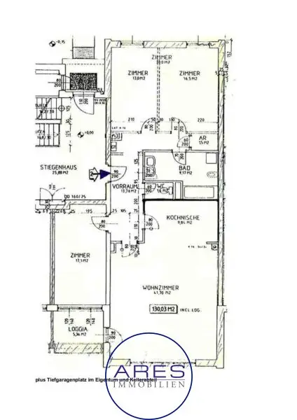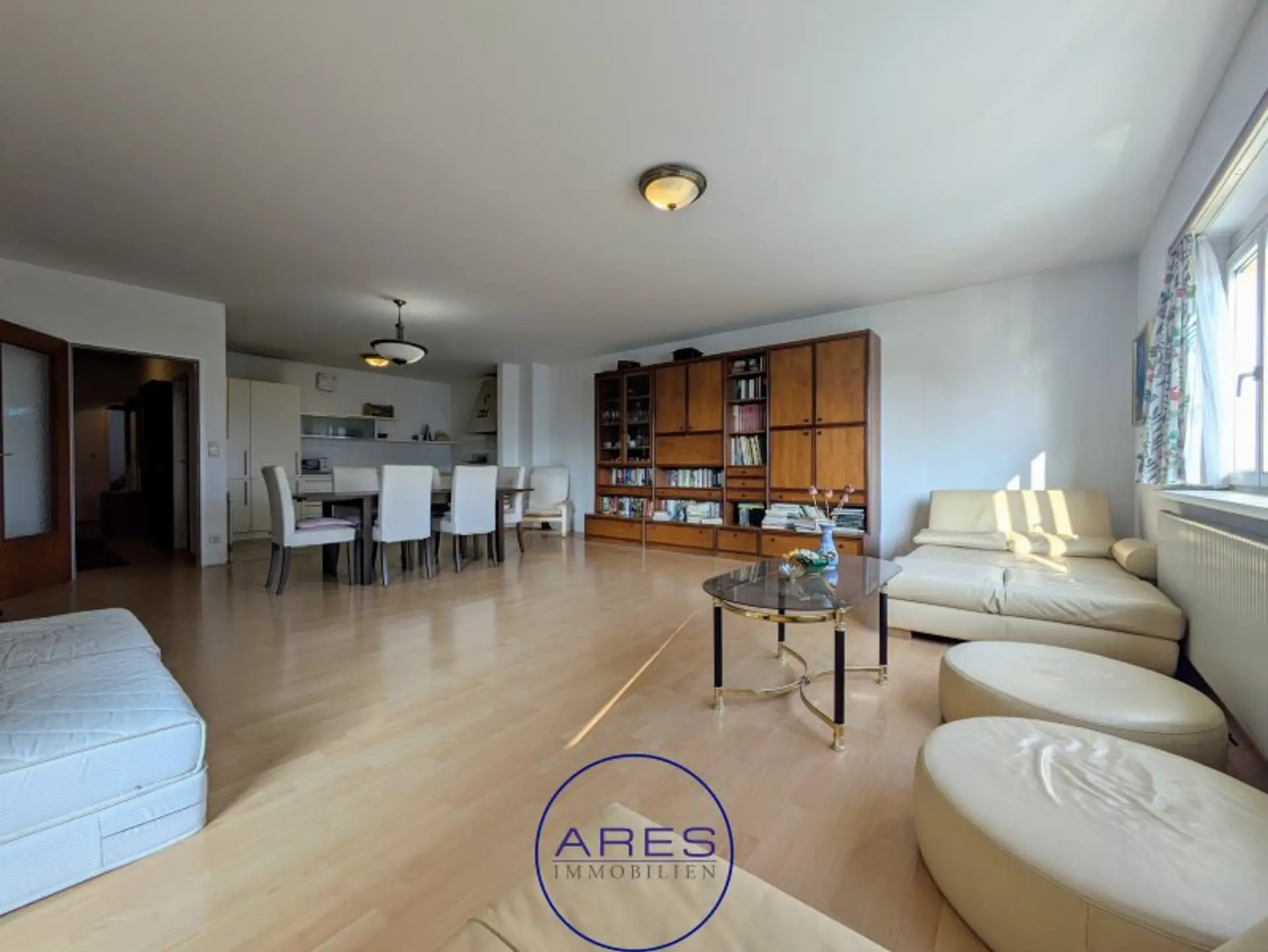 Neben dem sehr großzügigen Wohnzimmer mit offener Küche bietet die Wohnung 3 Zimmer, ein großes Badezimmer, Abstellraum und WC. Durch die optimale Raumaufteilung sind alle Räume zentral begehbar, wodurch die Wohnung sehr gut WG-geeignet ist. Die Loggia erreicht man über das Wohnzimmer. Bad und WC sind sanierungsbedürftig.