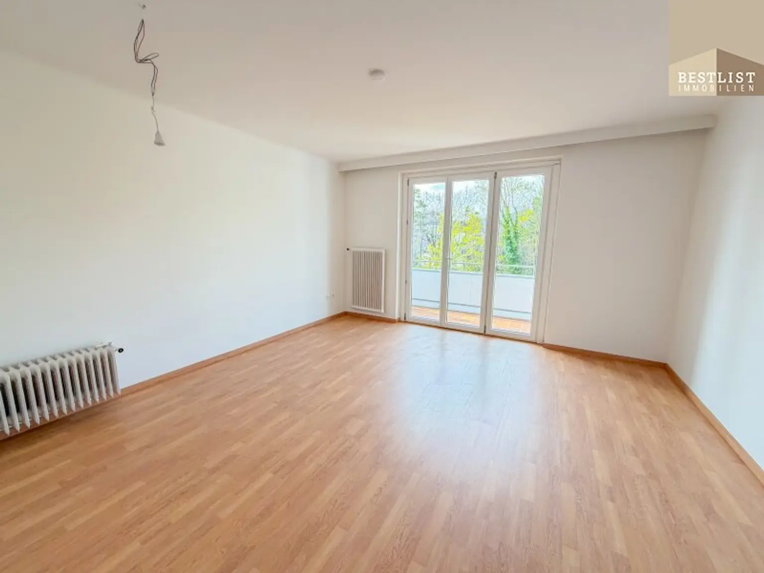Rechterhand entlang des Flurs gelangt man in das helle und einladende Wohnzimmer mit direktem Zugang zur westseitigen Loggia. Diese bietet ideale Voraussetzungen für entspannte Abendstunden in der Sonne und lädt zum Verweilen ein.