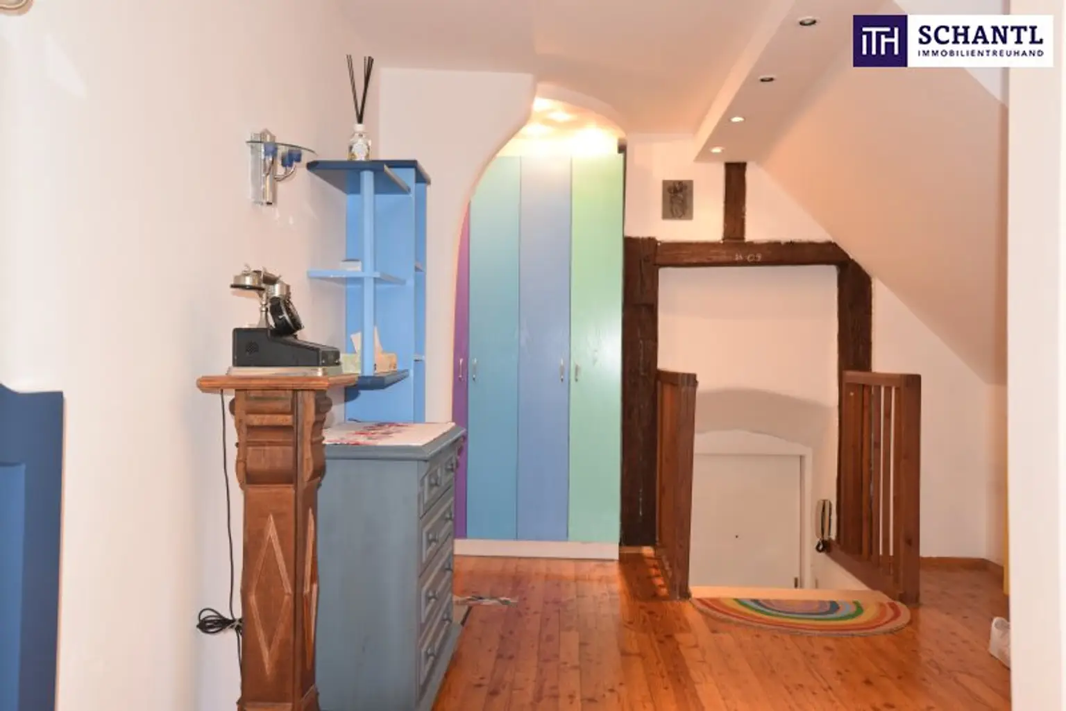 Maßgefertigte Einbauten in den Dachschrägen sorgen für optimalen Stauraum, während historische Details – wie ein gotischer Steintorrahmen und eine barocke Marienkrönungsskulptur – dem Haus besonderen Charme verleihen.