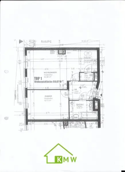 Die Wohnfläche von knapp 60m² verteilt sich auf Vorraum, Bad mit WC, Schlafzimmer, Wohnzimmer mit Essbereich und moderner Küche sowie einen Abstellraum.