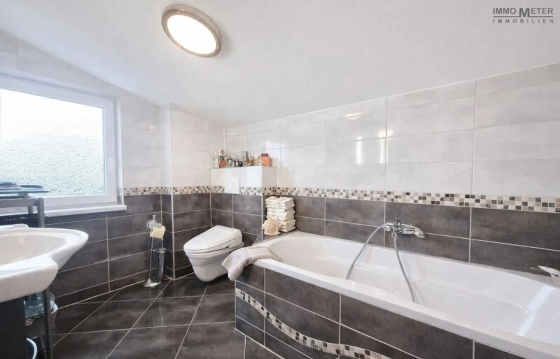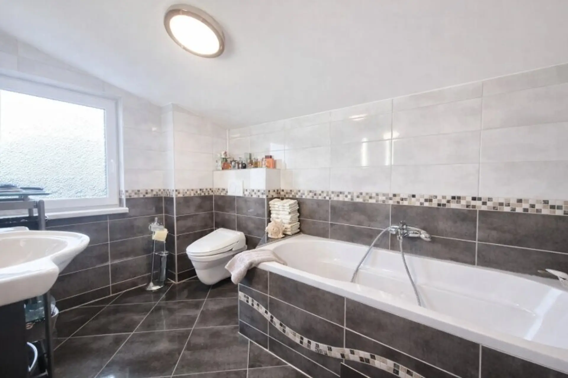 - Tageslicht-Badezimmer mit Badewanne, Waschbecken und WC