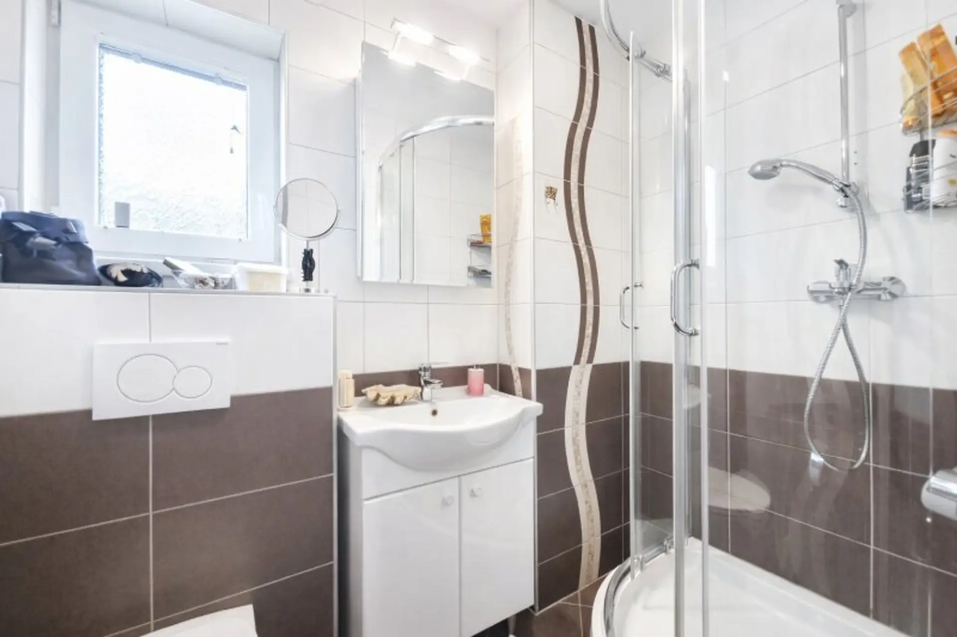 - Badezimmer mit Fenster, Dusche, Waschbecken und WC