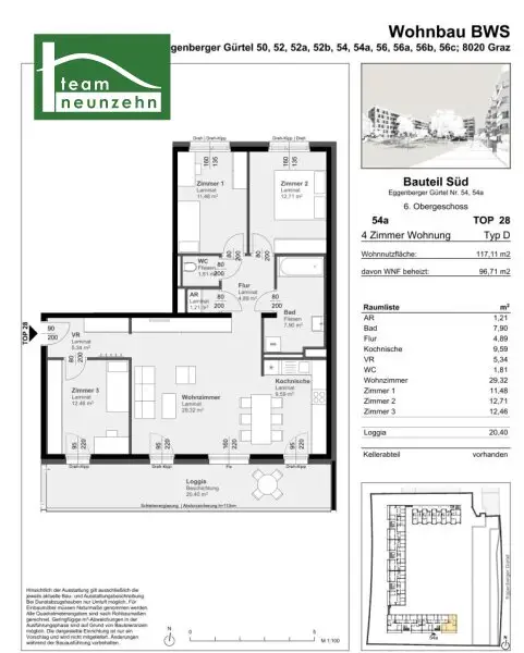 Wohnung Haus 54a, Top 28 – 4-Zimmer-Wohnung im 6. Obergeschoss mit Loggia