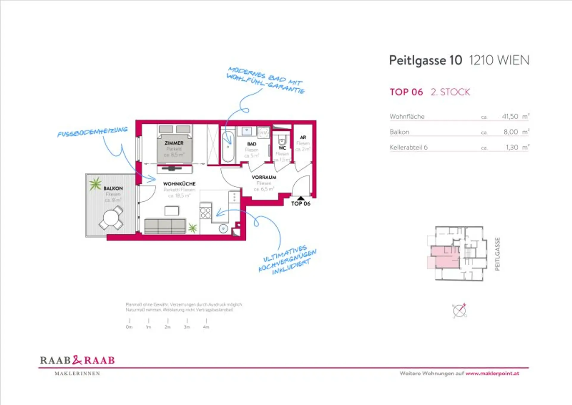 Die hochwertige Ausstattung dieser Wohnung lässt keine Wünsche offen. Genießen Sie den Komfort von Fußbodenheizung, die für wohlige Wärme sorgt, sowie die stilvollen Fliesen und das edle Parkett, die den Räumen eine elegante Note verleihen. Das Badezimmer ist mit einer Badewanne ausgestattet – ideal für entspannende Wohlfühlmomente nach einem stressigen Tag.