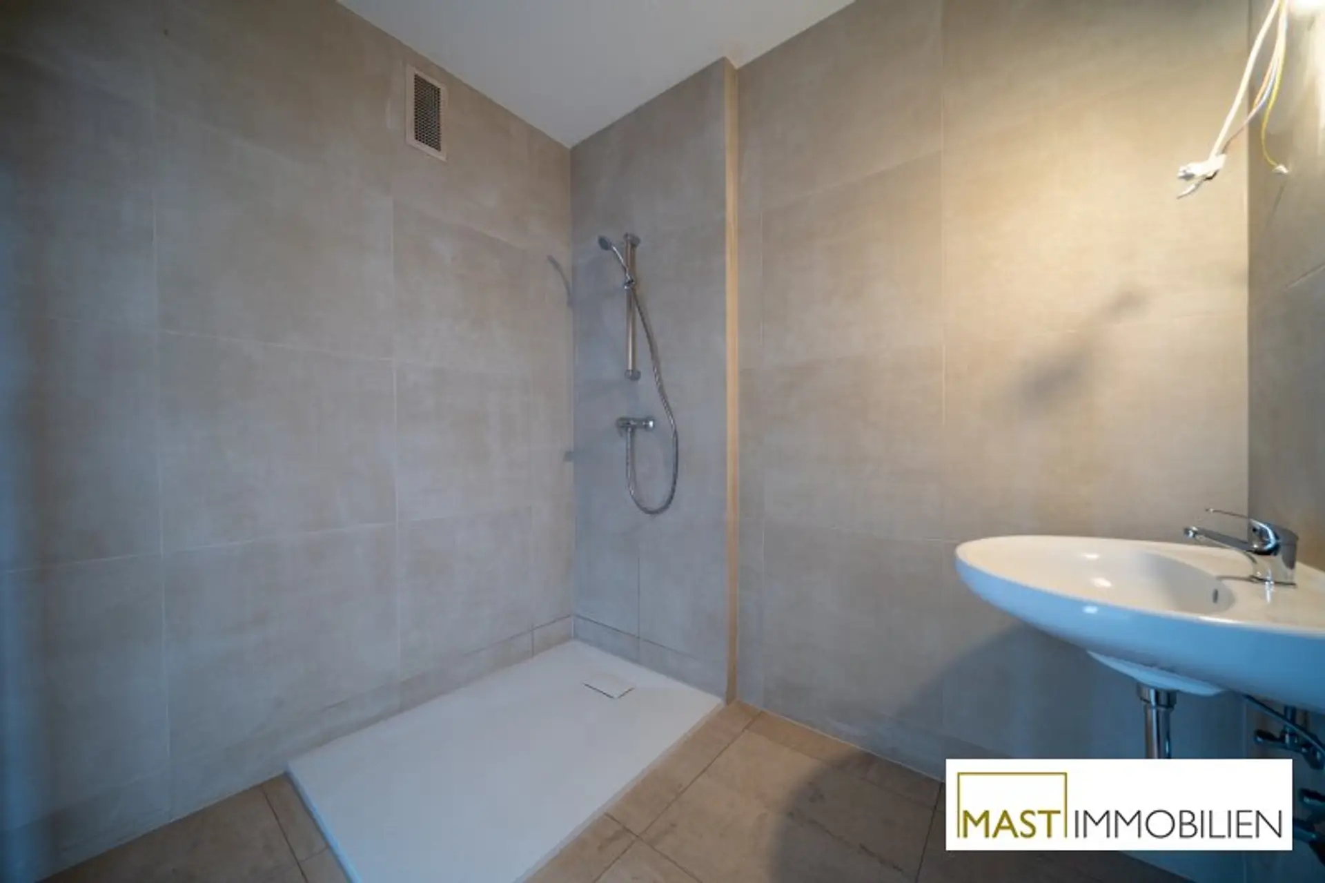 Das modern verflieste Badezimmer ist mit einer komfortablen Dusche ausgestattet.