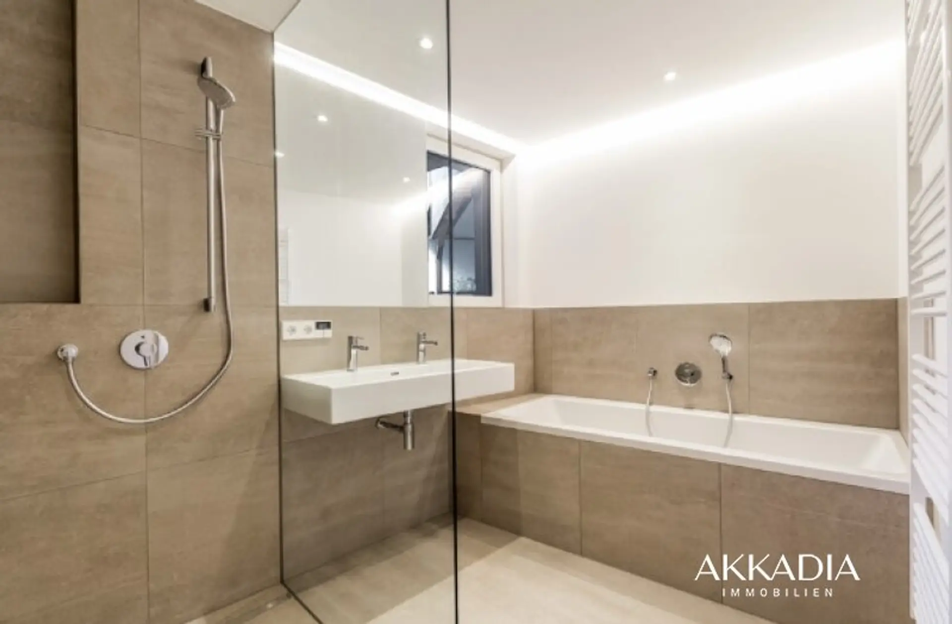 * Badezimmer mit Badewanne und Dusche mit Ausstattung der Linie Laufen Pro