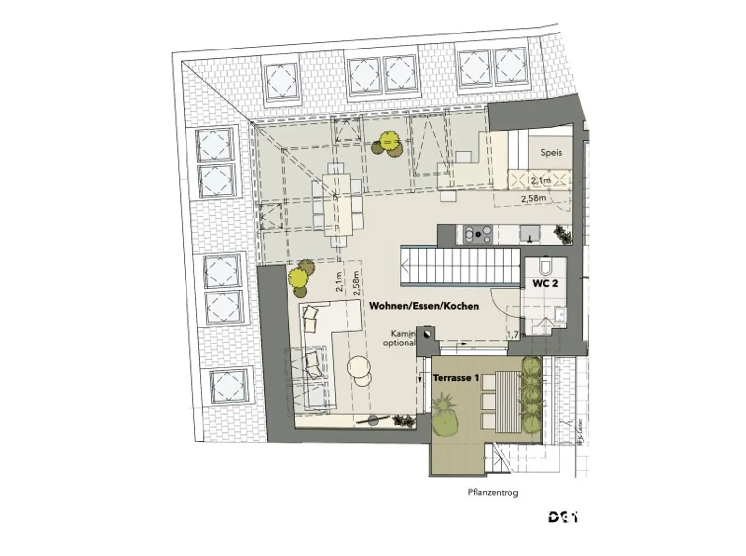 Der offen gestaltete Wohn-/Ess-/Kochbereich überzeugt durch seine angenehme Raumgröße und sorgt durch großzügige Fensterflächen für eine helle und freundliche Wohnatmosphäre. Von hier aus gelangt man direkt auf die Freiflächen der Wohnung, die den Wohnraum angenehm ins Freie erweitern und zusätzlichen Aufenthaltsraum im Außenbereich schaffen.