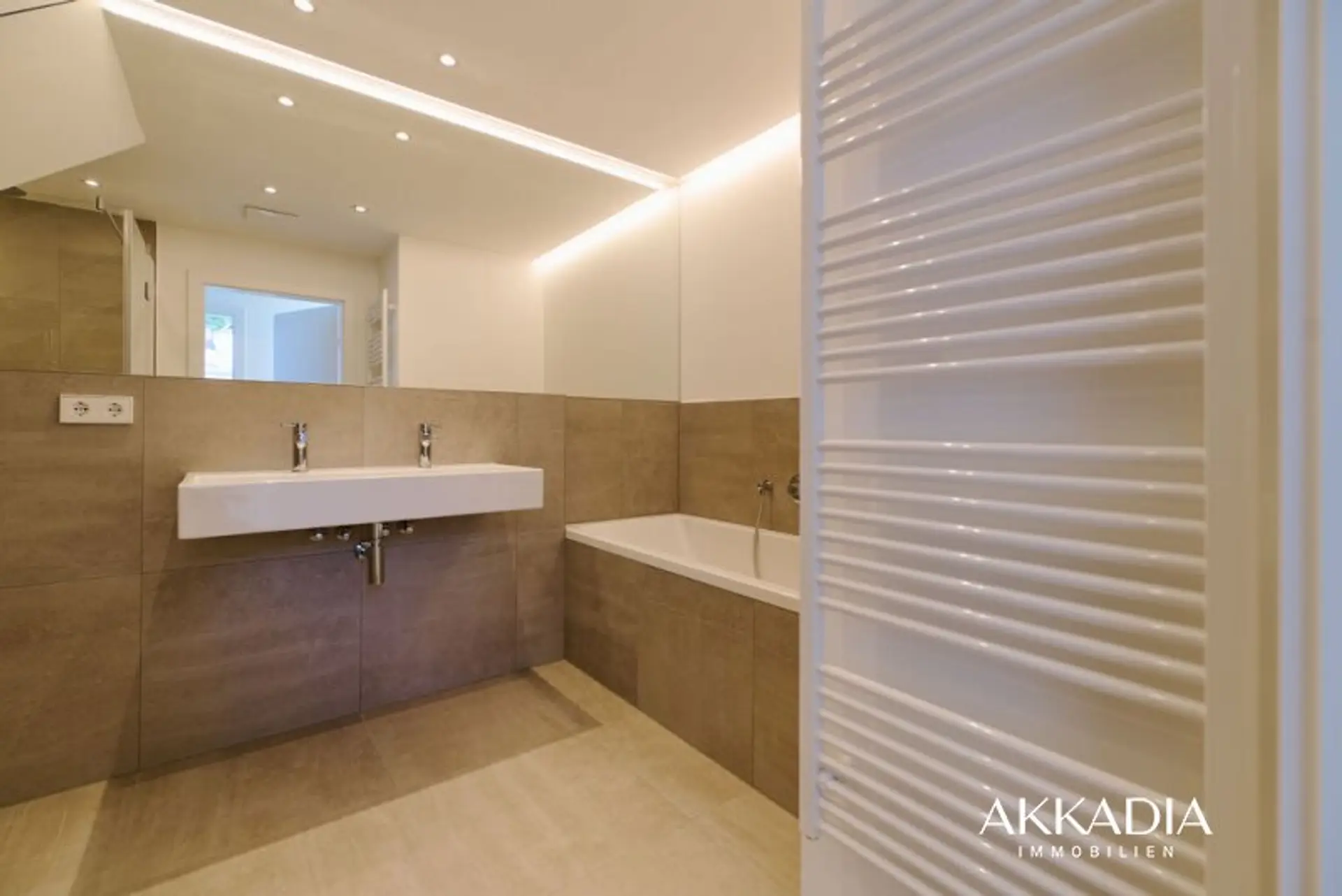 * Badezimmer mit Badewanne und Dusche mit Ausstattung der Linie Laufen Pro