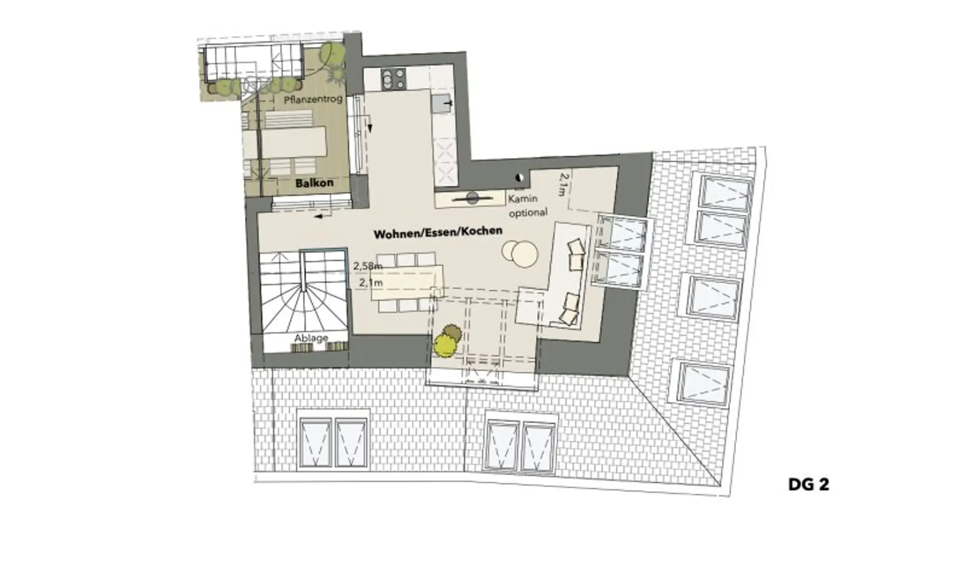 Den Mittelpunkt der Wohnung bildet der großzügige Wohnbereich im Obergeschoss. Der offen gestaltete Wohn-/Ess-/Kochbereich mit ca. 43,29 m² überzeugt durch seine Weitläufigkeit und sorgt durch großzügige Fensterflächen für eine helle und freundliche Wohnatmosphäre. Die architektonisch markante Panoramagaupe mit großflächiger Verglasungprägt den Raum und schafft ein besonderes Wohngefühl im Dachgeschoss.