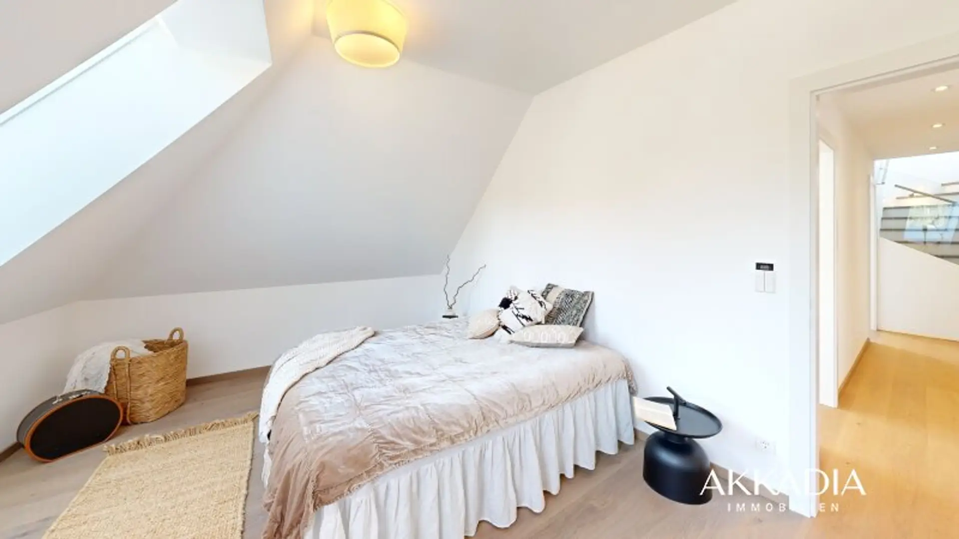 Die privaten Räume befinden sich im unteren Geschoss der Wohnung. Hier stehen vier separat begehbare Schlafzimmer zur Verfügung, wodurch sich flexible Nutzungsmöglichkeiten – etwa als Kinderzimmer, Gästezimmer oder Homeoffice – ergeben.