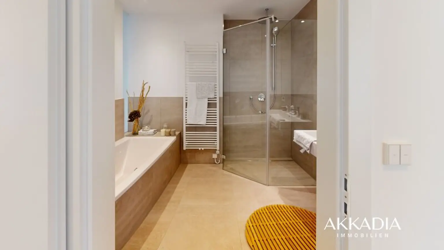 Das Badezimmer mit Badewanne und Dusche sorgt gemeinsam mit einem separaten WC für hohen Wohnkomfort. Ein Technik- bzw. Abstellraum sowie ein weiterer Abstellraum bieten zusätzlichen Stauraum und unterstreichen die funktionale Planung der Wohnung.