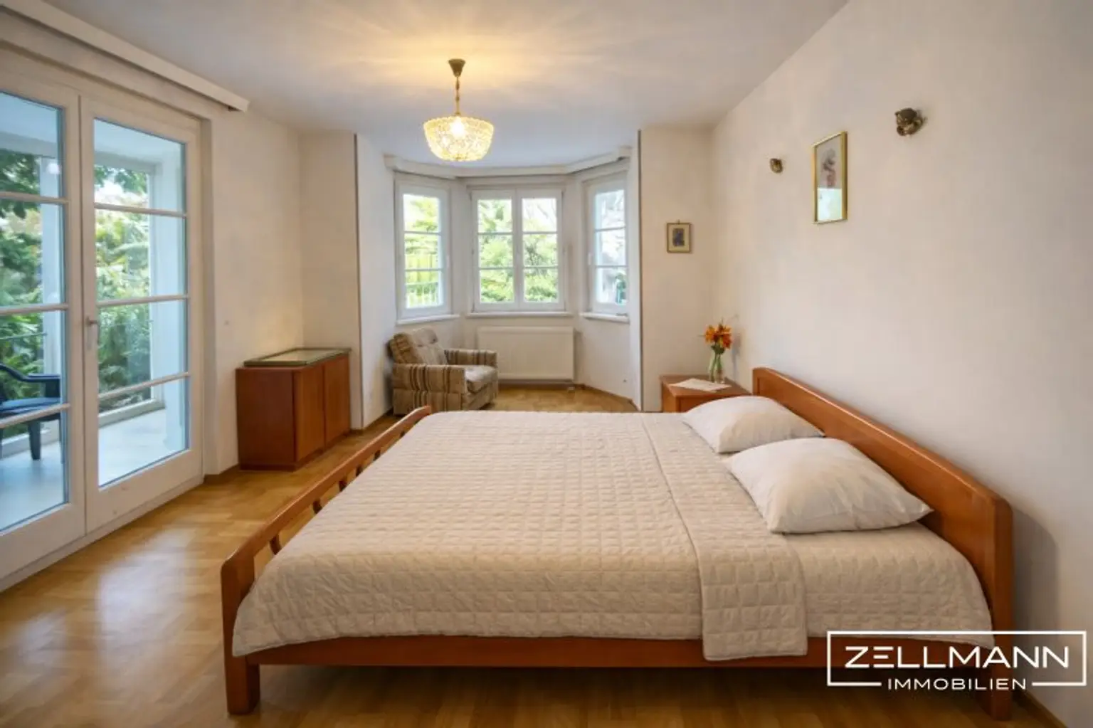 Das sehr große Schlafzimmer verfügt über eine verglaste Loggia mit freiem Blick ins Grüne. Diese Fläche lässt sich nahezu ganzjährig nutzen und erhöht den Wohnkomfort deutlich.