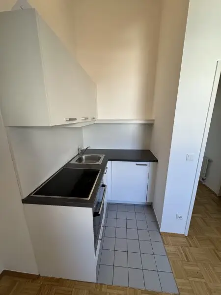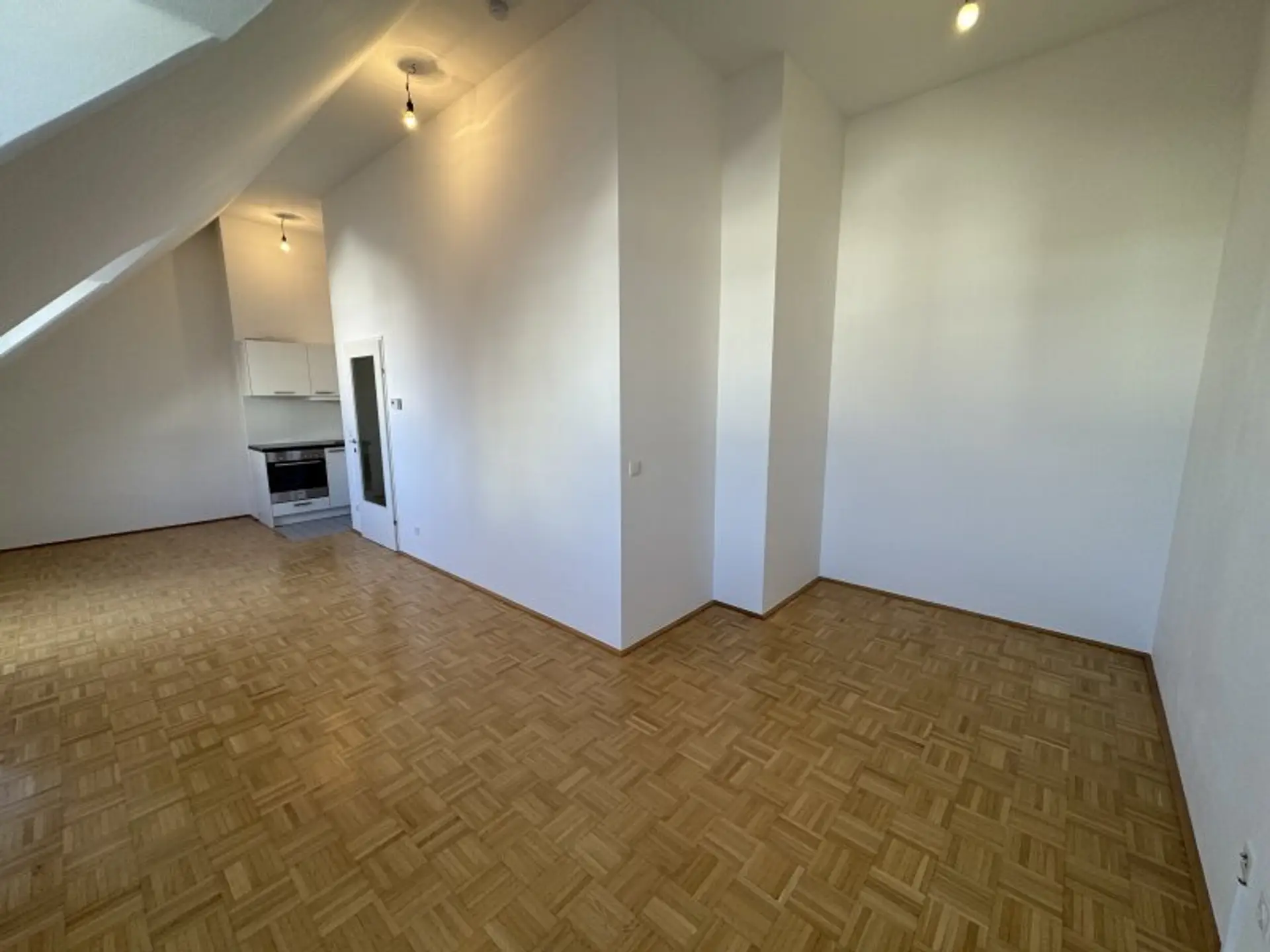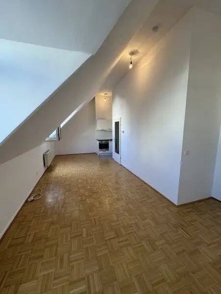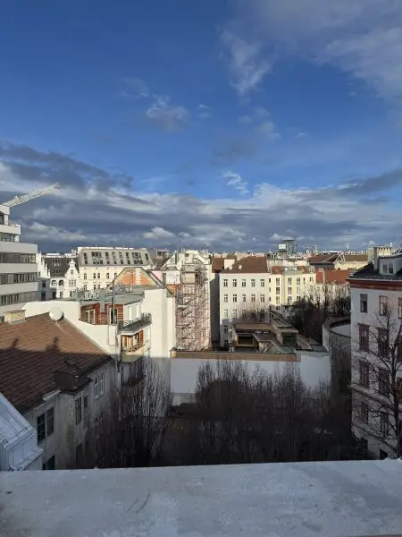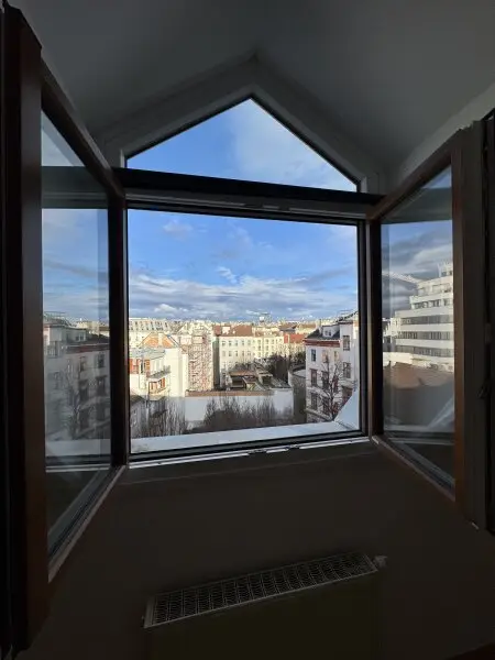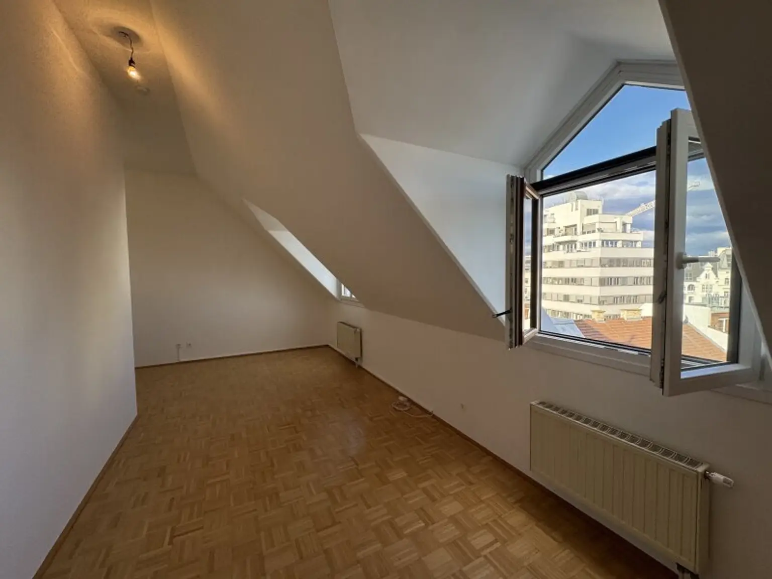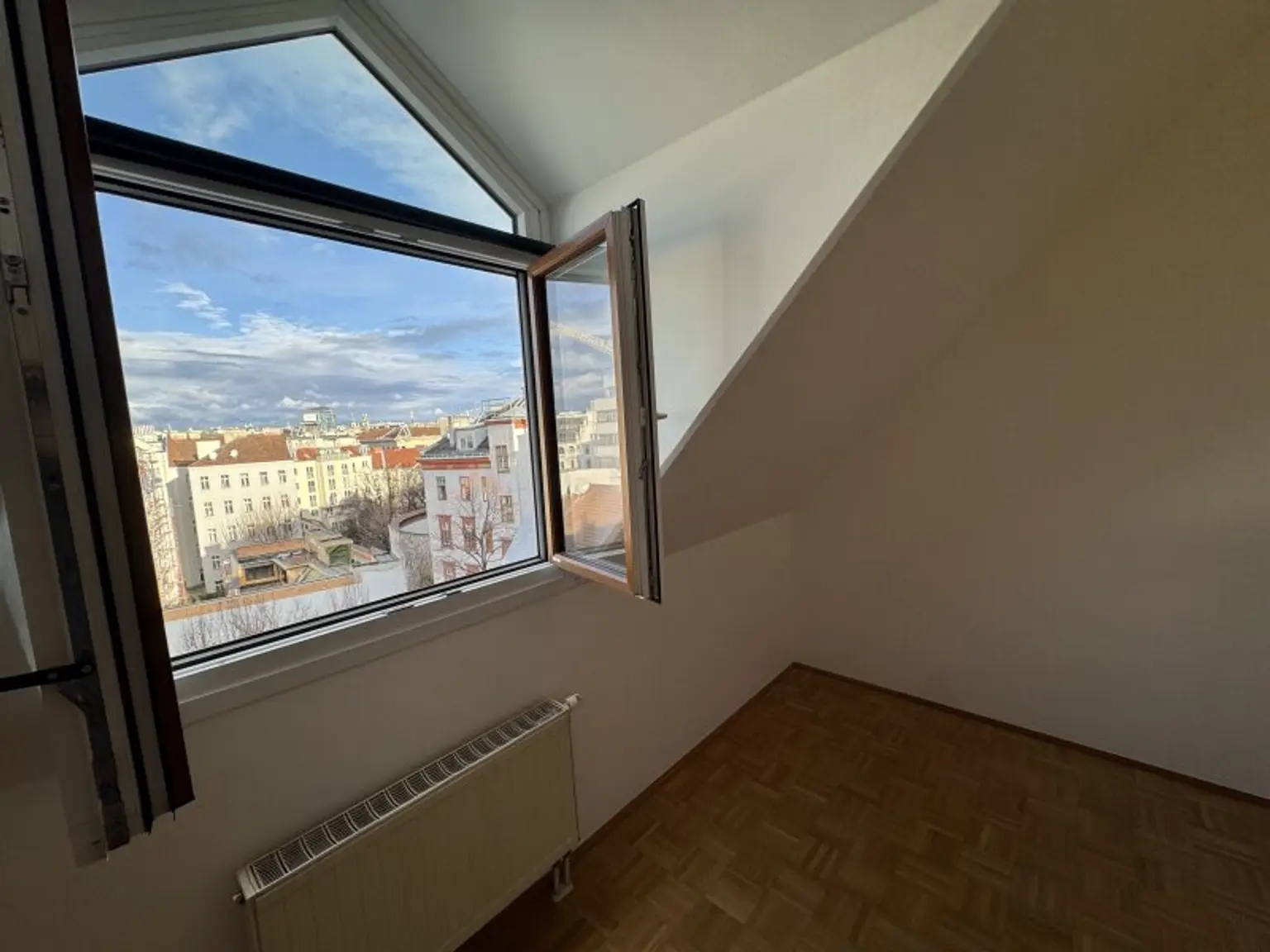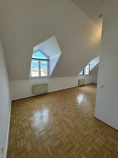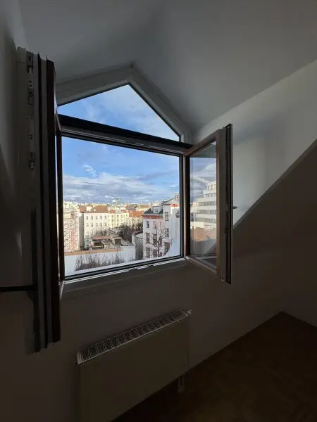 Zwei großzügige Fensterflächen im Dachgeschoss durchfluten den Raum mit Tageslicht und eröffnen einen freien Blick über die Wiener Dachlandschaft. Markante Bauwerke wie das Haus des Meeres prägen das Panorama und verleihen dieser Wohnung einen besonderen Seltenheitswert.