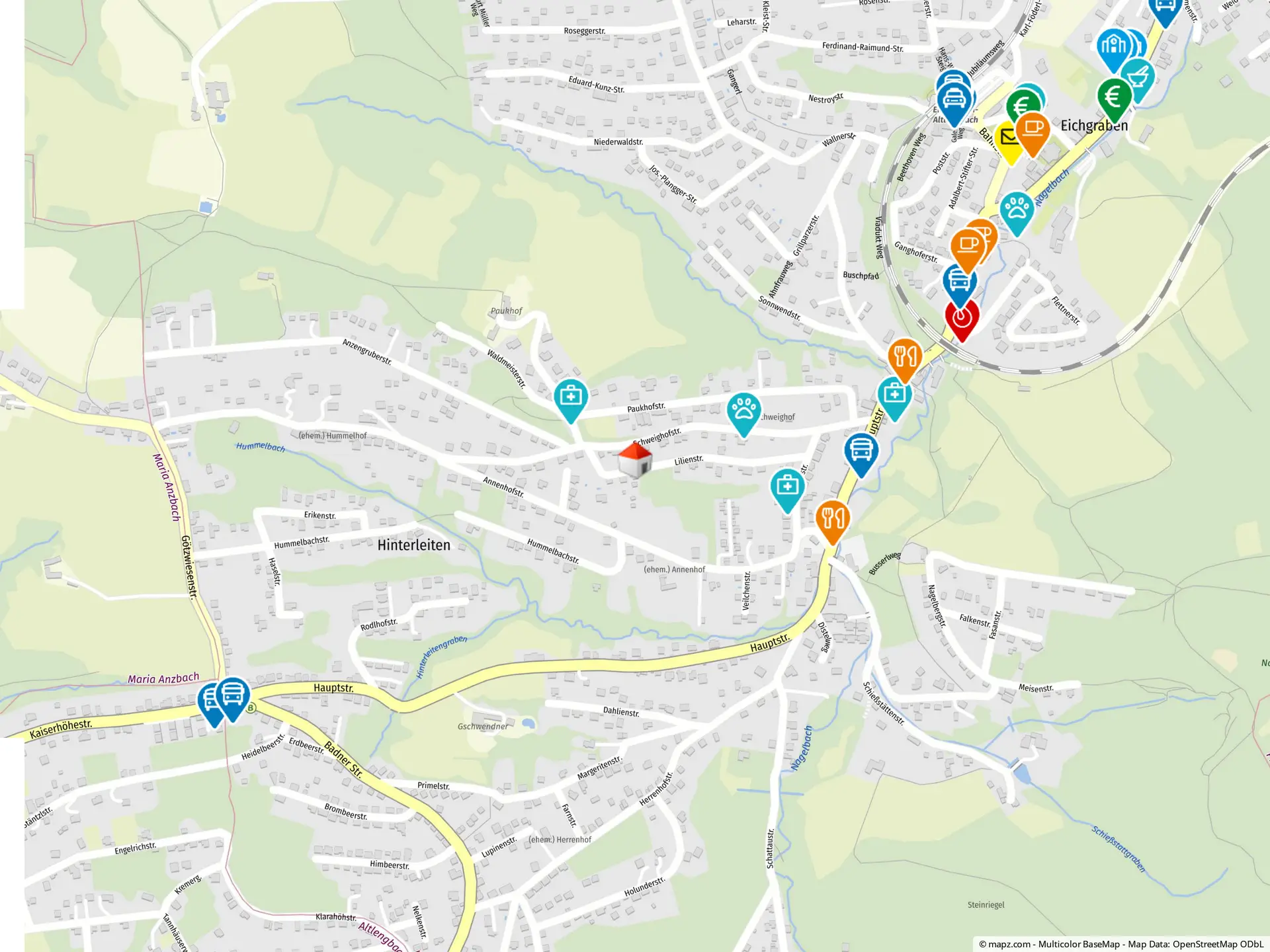 Die Immobilie befindet sich in Eichgraben, etwa 30 km westlich von Wien. Diese Lage bietet eine hohe Lebensqualität durch eine ruhige, naturnahe Umgebung und eine gute Anbindung an das öffentliche Verkehrsnetz. Die Umgebung kombiniert ländlichen Charme mit moderner Infrastruktur und ist ideal für Familien sowie Berufspendler.