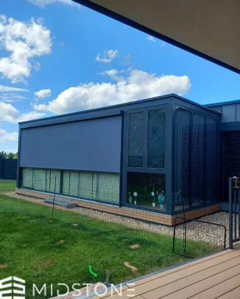 * Stehfalzfassade von Prefa sowie Rollläden und Insektengitter
