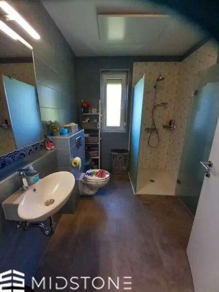 Die offene Wohnküche mit moderner Einbauküche bildet einen zentralen Treffpunkt und schafft eine einladende Atmosphäre für gemeinsame Zeit. Hochwertige Materialien wie Vinylböden und stilvolle Fliesen sorgen für ein gepflegtes und zeitgemäßes Wohngefühl. Zwei Badezimmer mit Fenstern sowie zwei WCs bieten zusätzlichen Komfort im Alltag.