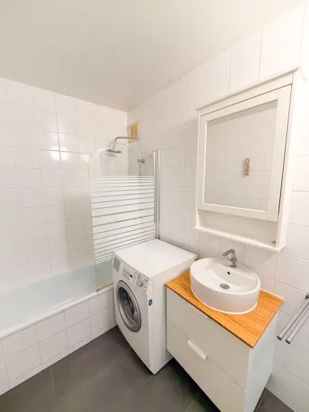 Badezimmer mit Badewanne und Waschmaschine