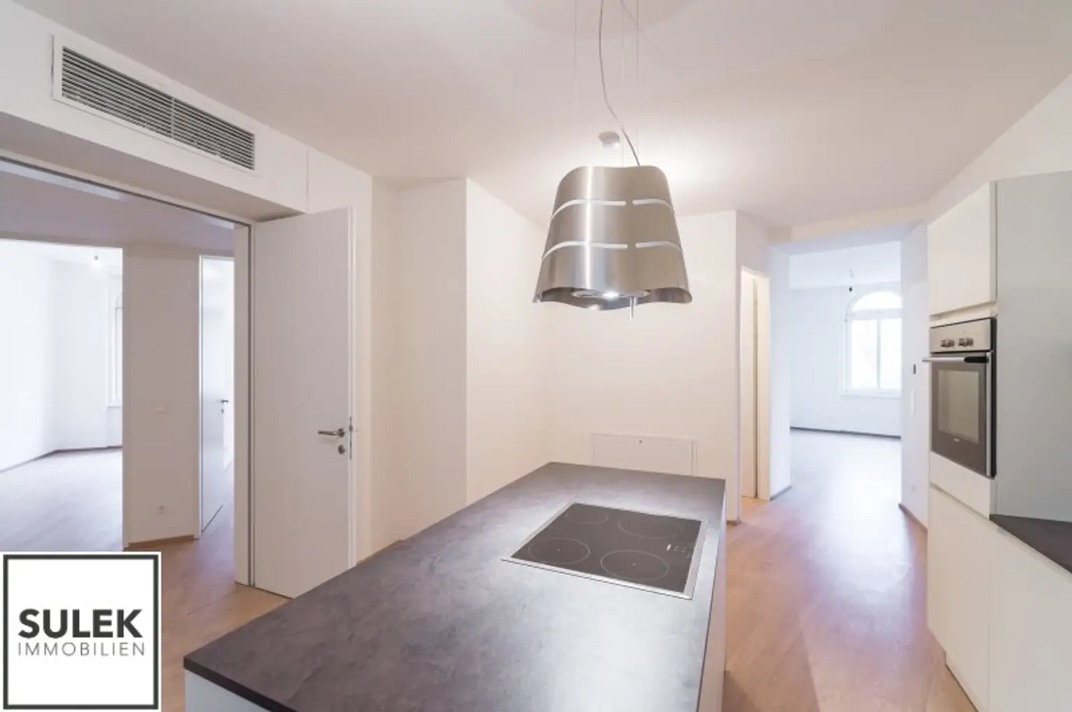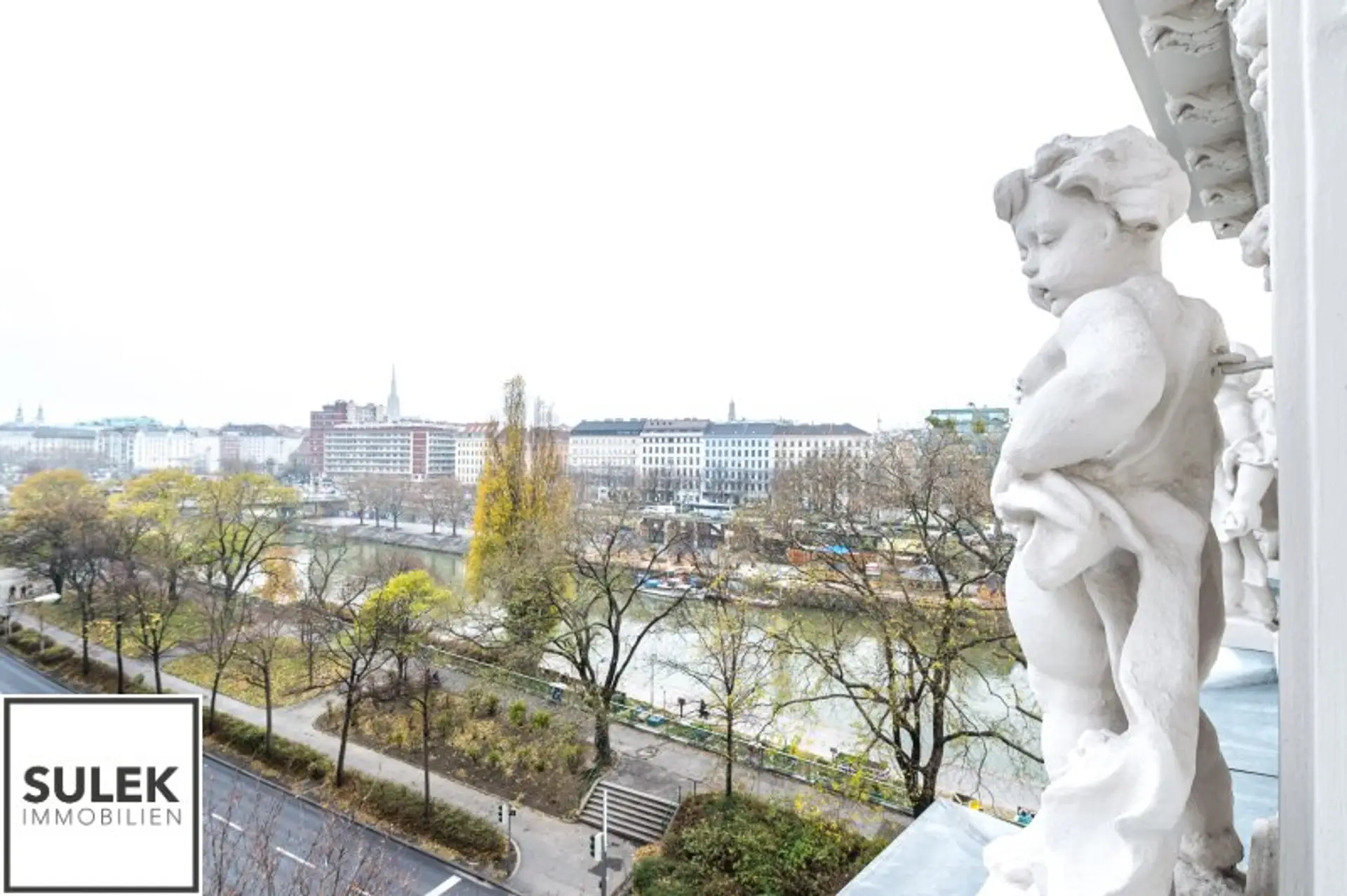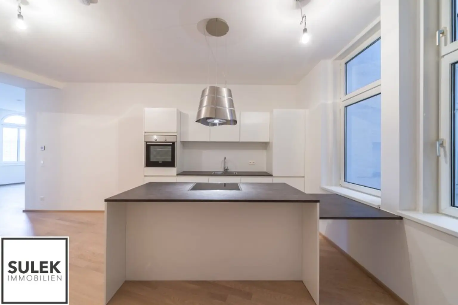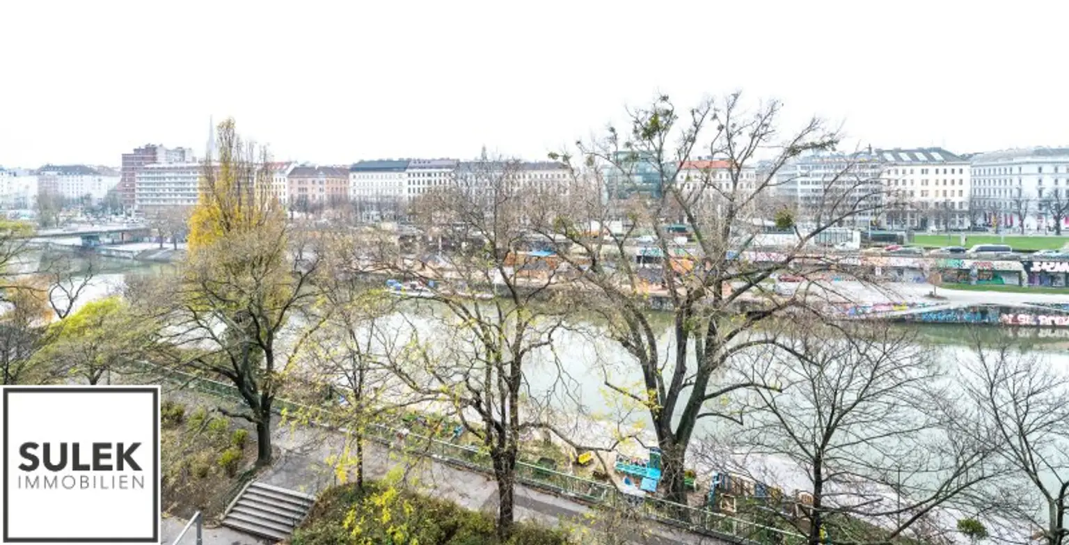 Über die Küche gelangen Sie zum knapp 40m2 großen Ess- und Wohnbereich, welcher einen schönen Ausblick über den Wienfluss auf den 1. Bezirk und auf die Turmspitze des Stephansdom bietet.