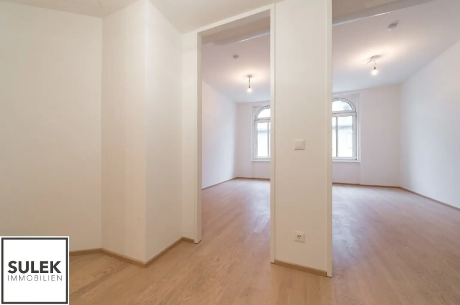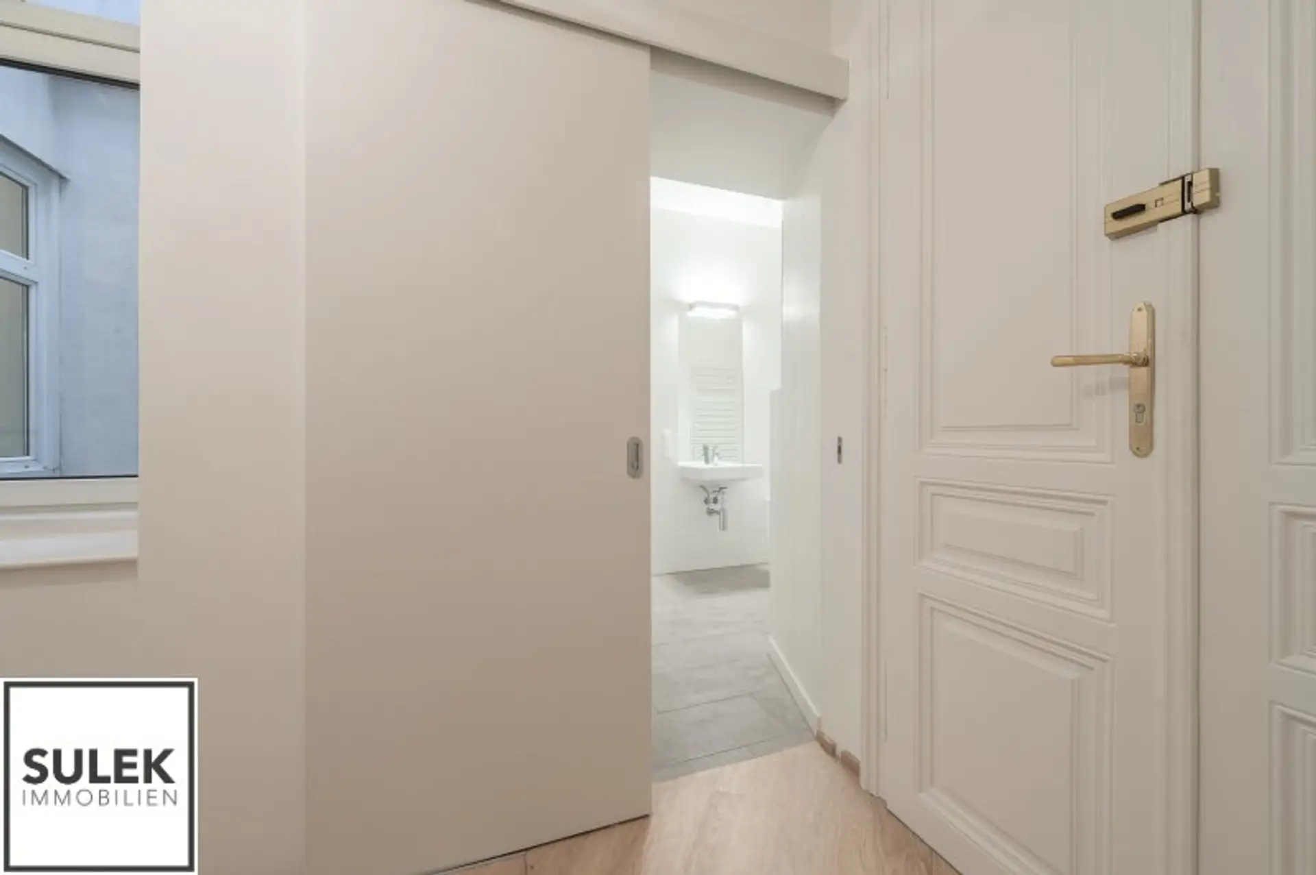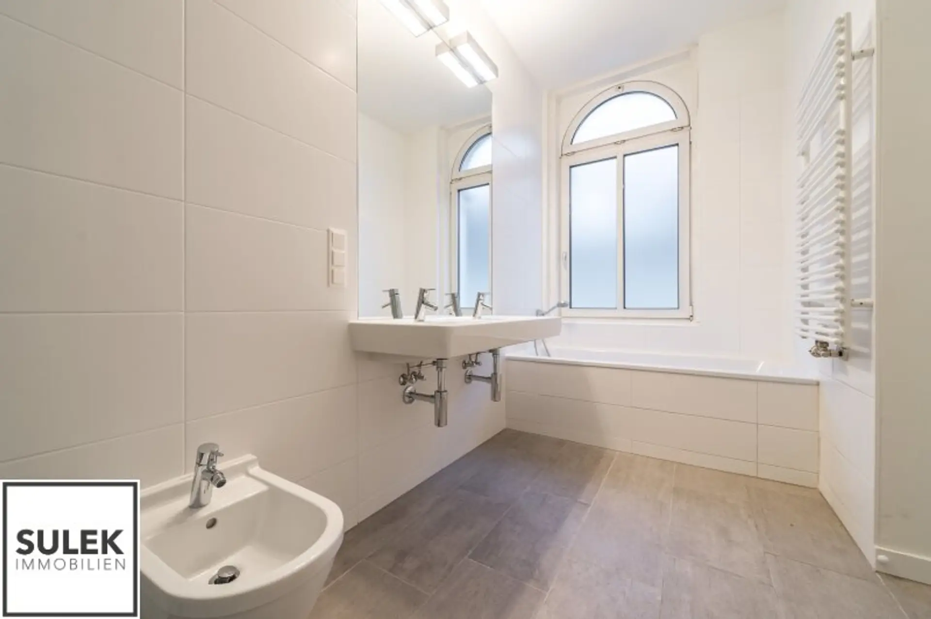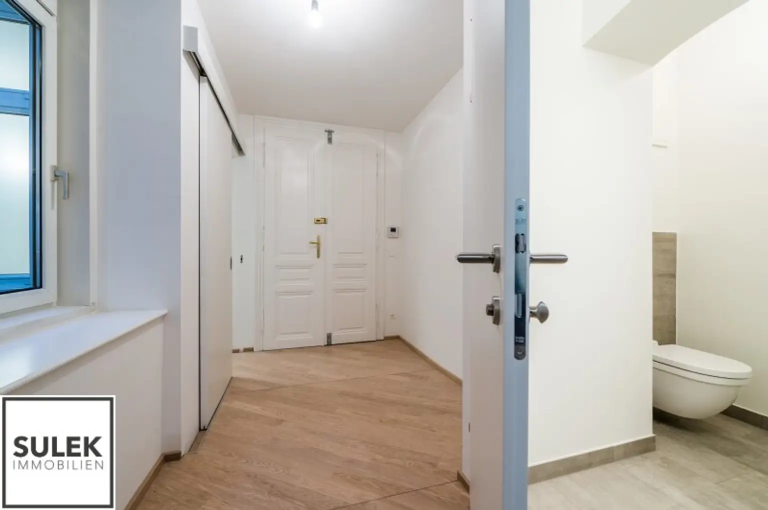 Diese Dachgeschoss - Wohnung ist im 4. Stock eines durchgreifend sanierten Altbaus mit Stilfassade gelegen und wird über einen zentralen Vorraum betreten. Vom Vorraum aus erreichen Sie 2 ident Große große Schlafzimmer, ein Badezimmer mit Wanne und Toilette, sowie eine Gästetoilette mit Handwaschbecken.