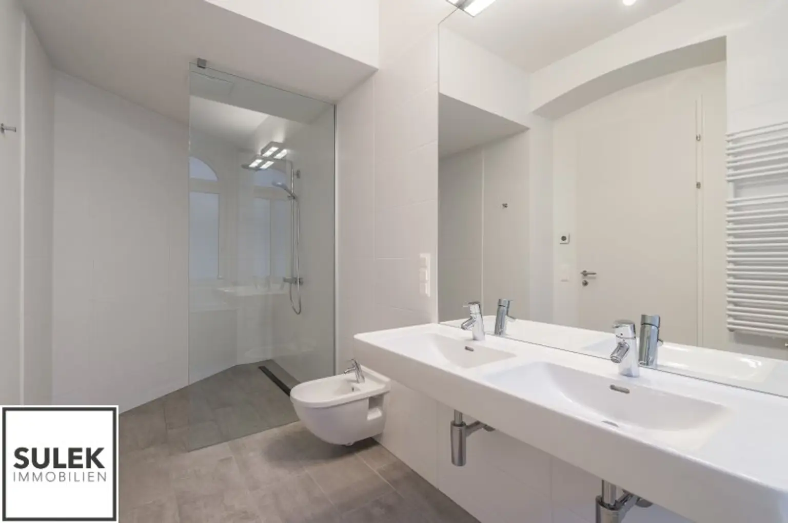 Vom Wohnraum aus gelangen Sie zum Master-Bedroom mit en-Suite Badezimmer, welches über eine Badewanne, eine 2-Personen-Dusche, ein Doppelwaschbecken und eine Toilette verfügt. Auch aus diesem Zimmer genießen Sie den Ausblick über den Wienfluss.