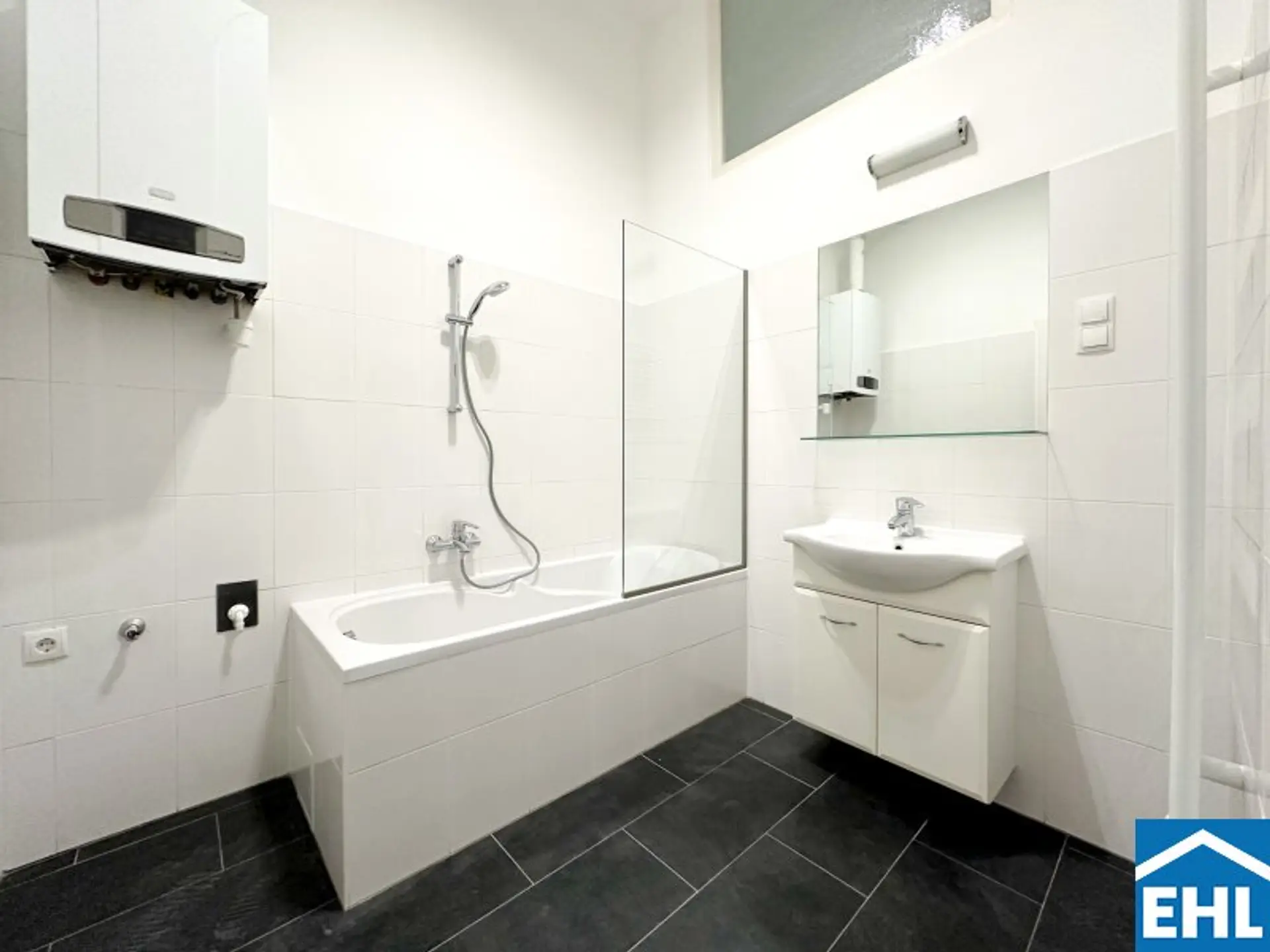 * Badezimmer mit Badewanne und Waschmaschinenanschluss